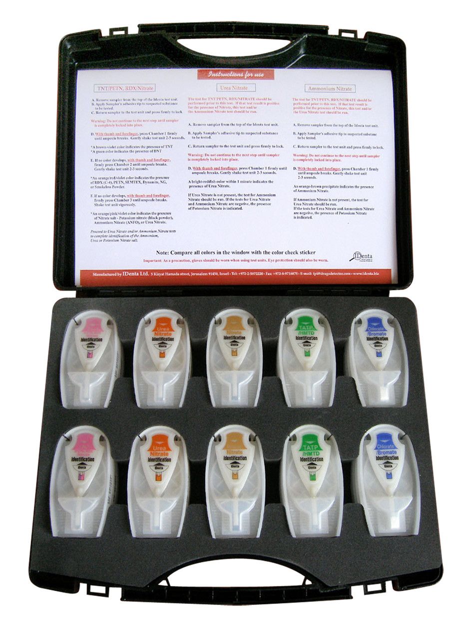 For professionals who need quick, on-the-spot results, identa Professional Explosives Detection Master Kit and Test Kits are the answer. Based on advanced kit design and chemical technologies, these sensitive explosives identification test kits react with the questioned substance in an internal "test tube", separating the user from any contact with the reagent. Identifying illegal substances is safe, quick, and easy with the IDenta Alert kits – and cost effective enough for frequent use, as needed.